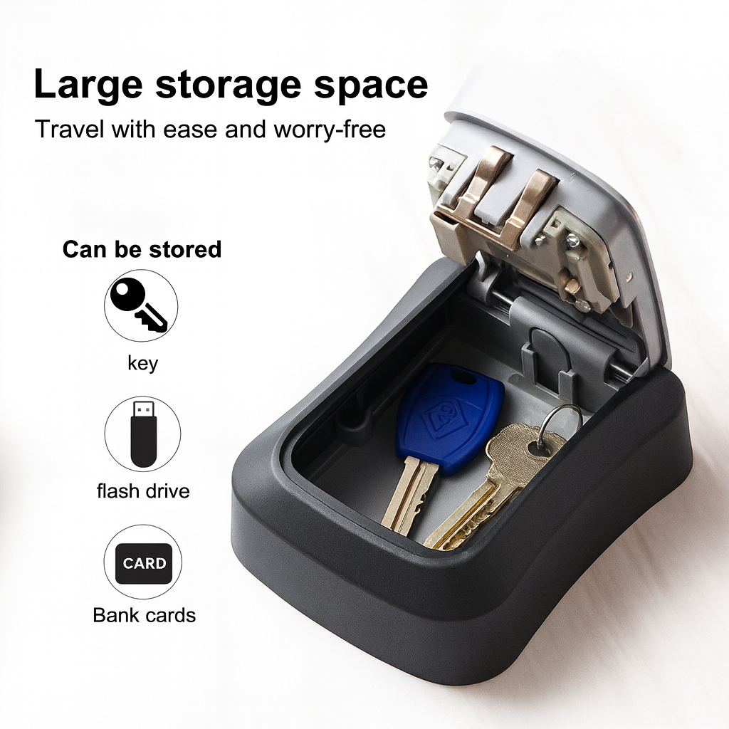 The interior compartment provides space for up to 5 standard keys, 1–2 access cards, or small objects such as a USB drive. The solid body and protective cover help keep contents secure outdoors.